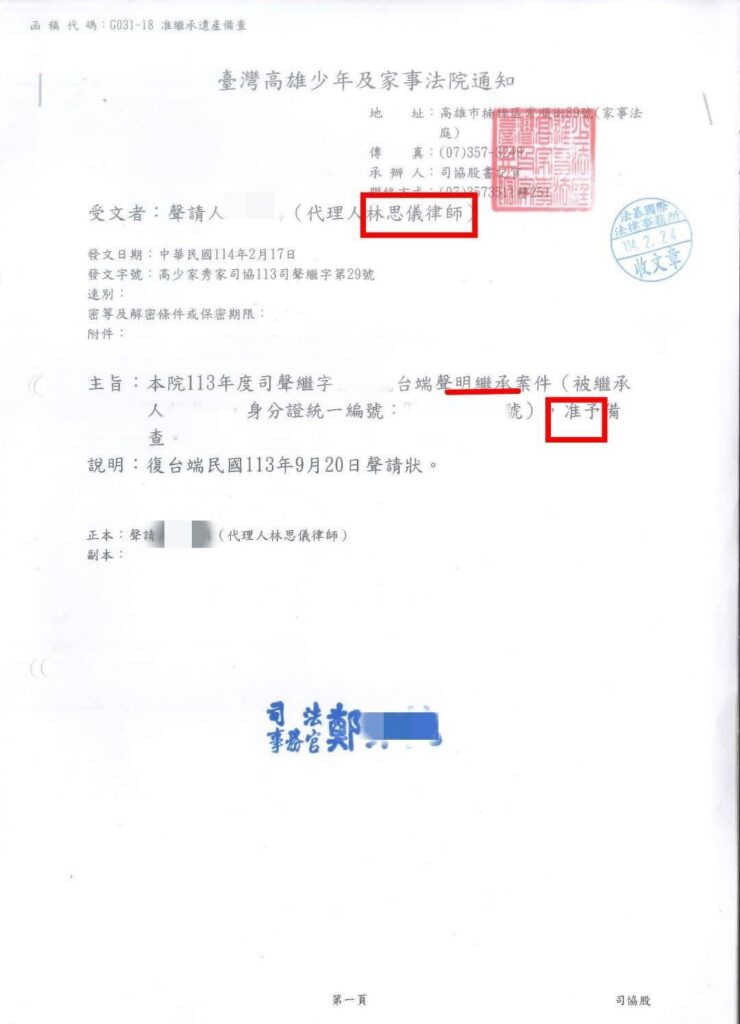本所主持律師林思儀律師,協助大陸人民繼承臺灣親屬之遺產,成功准予繼承!